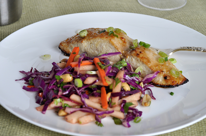 We all have times when we want a simple, light meal with clean, fresh flavors and this is a meal for those times. Blending the miso glaze is a snap and it flavors the flaky Mahi almost effortlessly with just the right mix of savory and salt. The crunchy slaw is really the star of this show with colorful red cabbage, carrot, peanuts and tart apple tossed with rice vinegar, brown sugar and salt. You asked for it. Here it is. Light, healthy and delicious all in under 30 minutes.